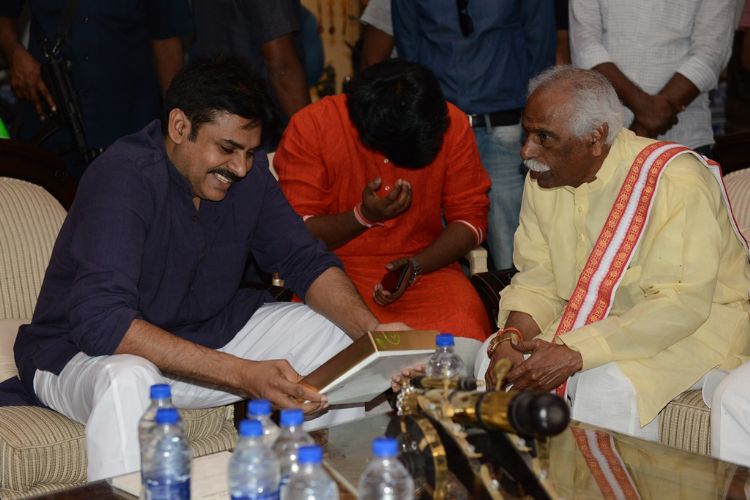 Union Minister Bandaru Datthathreya met Janasena Chief and Cine Actor Pawan Kalyan and invited him to attend his daughter marriage at Katamarayudu sets in Hyderabad on 20th November 2016.