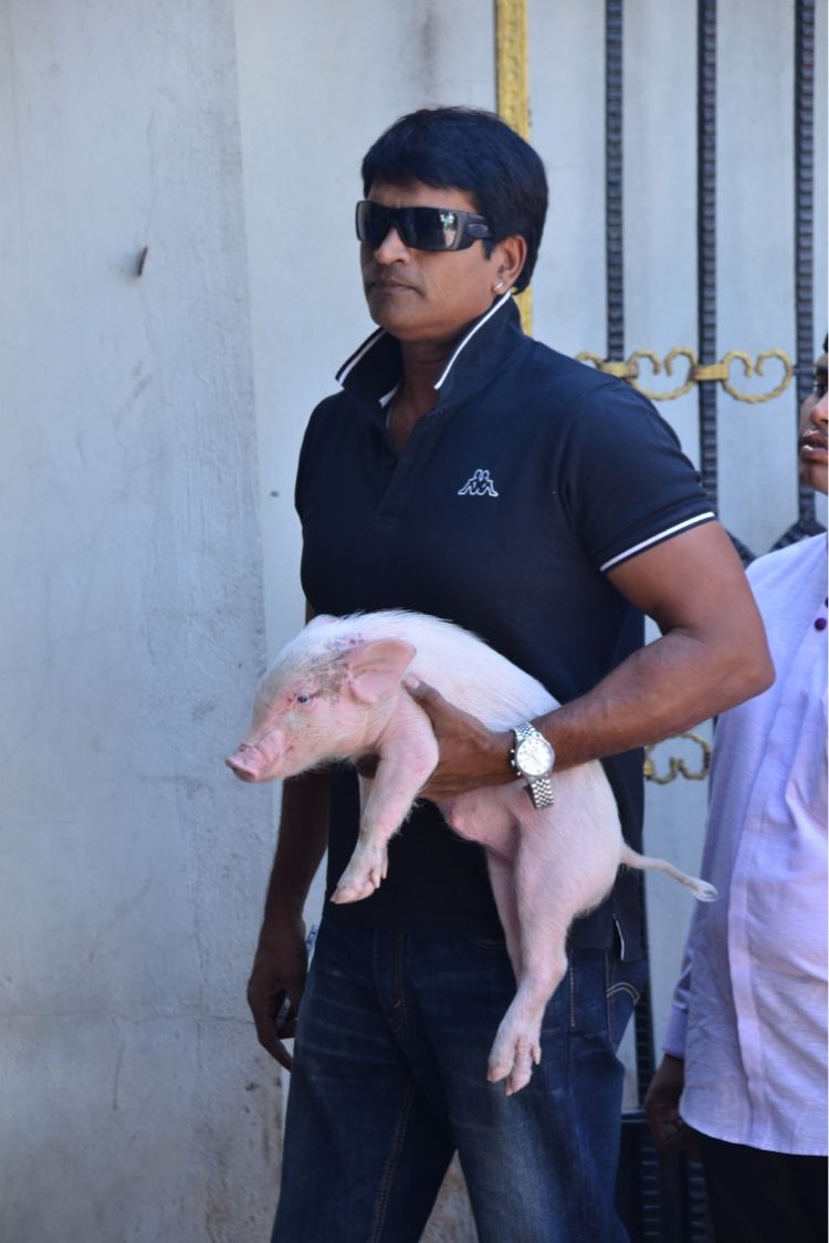 Creative filmmaker Ravibabu and his piglet stood in the Queue to withdraw money from ATM in Hyderabad on 23rd November 2016. His new film Adugo is a sensational project in production with baby pig in central lead.