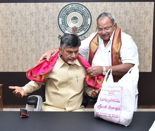 TTD Chairman Dr Chadalawada Krishnamoorthy on Thursday called the Chief Minister Nara Chandrababu Naidu at the Velagapudi Office and presented Srivari Prasadam and Shaluva on the occasion. He appraised the CM on the success of the Sri Venkateswara Vaibhaotsavam held at New Jersey in US.