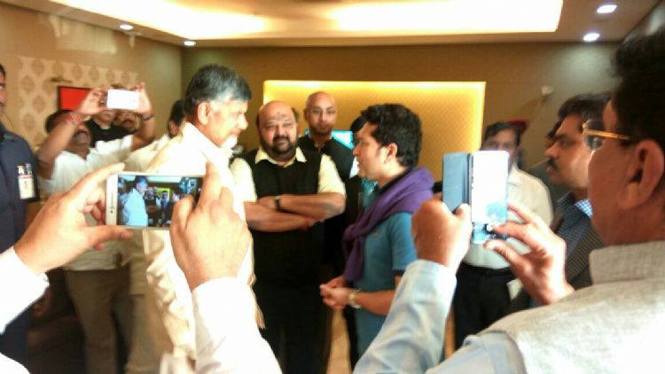 Andhra Pradesh Chief Minister Chandrababu Naidu met master blaster Sachin Tendulkar at Delhi Airport and discussed the development work of the village Puttam Raju Kandriga in Nellore District adopted in the state on 3rd December 2016.