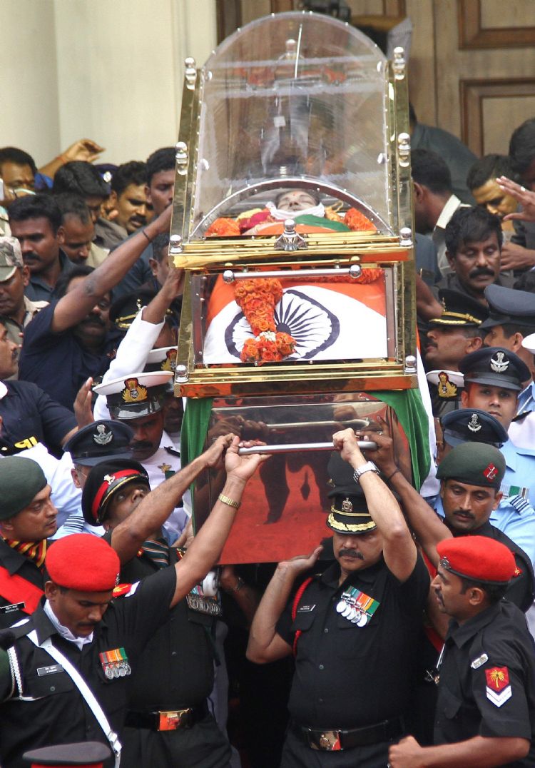 Tamil Nadu Chief Minister Jayalalitha was buried next to the memorial of Dr MGR at Marina Beach in Chennai. Lakhs of followers gathered along the route to pay their final respects to Jayalalitha on 6th December 2016.