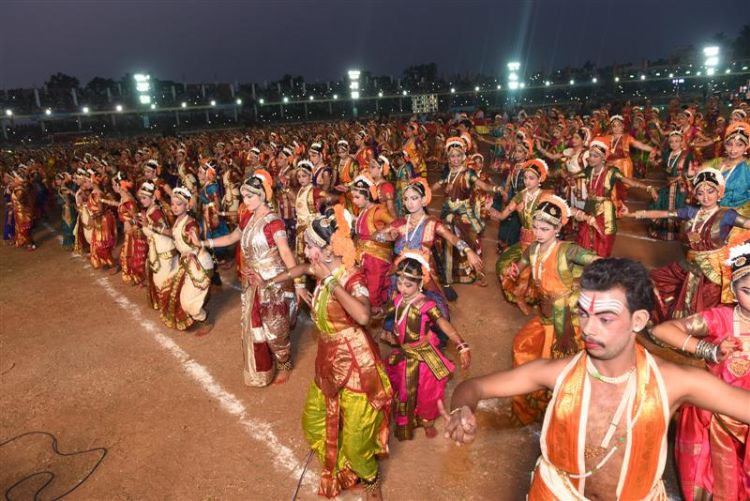 A Group of 7000 Kuchipudi Dancers performing Maha Brunda Natyam in 5th International Kuchipudi Dance Festival at Indira Gandhi Municipal Stadium in Vijayawada on 25th December 2016.