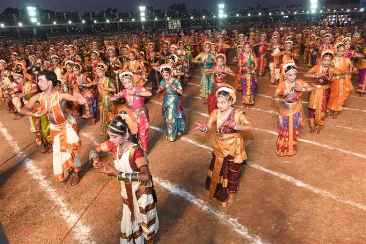 A Group of 7000 Kuchipudi Dancers performing Maha Brunda Natyam in 5th International Kuchipudi Dance Festival at Indira Gandhi Municipal Stadium in Vijayawada on 25th December 2016.