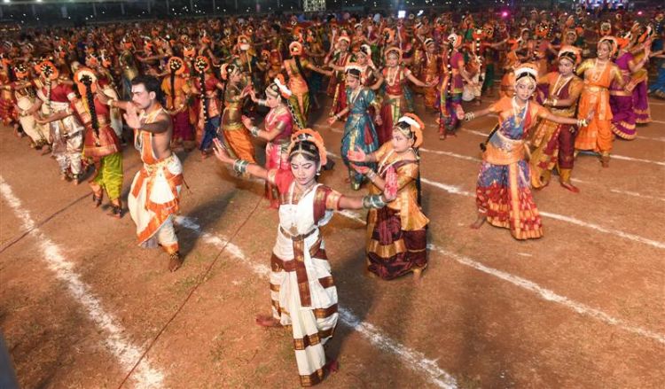 A Group of 7000 Kuchipudi Dancers performing Maha Brunda Natyam in 5th International Kuchipudi Dance Festival at Indira Gandhi Municipal Stadium in Vijayawada on 25th December 2016.