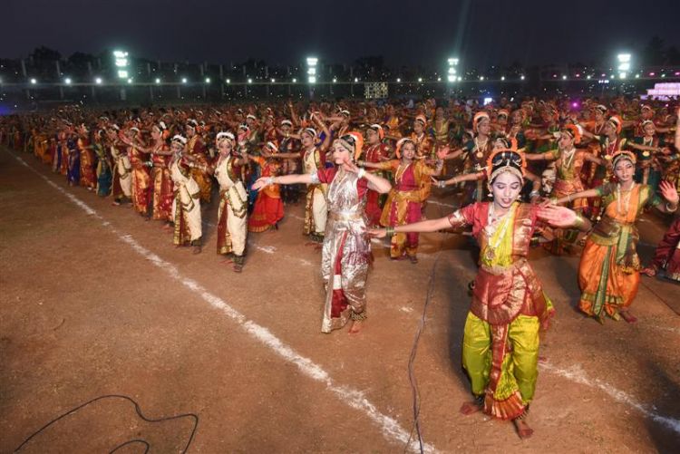 A Group of 7000 Kuchipudi Dancers performing Maha Brunda Natyam in 5th International Kuchipudi Dance Festival at Indira Gandhi Municipal Stadium in Vijayawada on 25th December 2016.