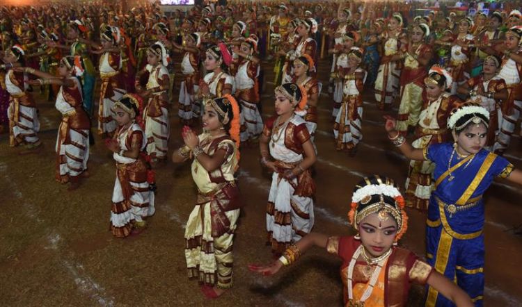 A Group of 7000 Kuchipudi Dancers performing Maha Brunda Natyam in 5th International Kuchipudi Dance Festival at Indira Gandhi Municipal Stadium in Vijayawada on 25th December 2016.
