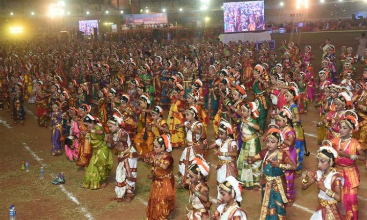 A Group of 7000 Kuchipudi Dancers performing Maha Brunda Natyam in 5th International Kuchipudi Dance Festival at Indira Gandhi Municipal Stadium in Vijayawada on 25th December 2016.