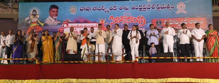 Union Minister for Urban Development, Housing M. Venkaiah Naidu along with Chief Minister of Andhra Pradesh N. Chandrababu Naidu holding aloft the Guinness Book of World Records certificate issued for the largest Kuchipudi dance performance at the International Kuchipudi Convention in Vijayawada on 25th December 2016.