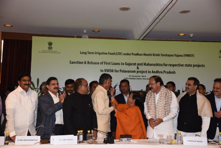 Andhra Pradesh Chief Minister N. Chandrababu Naidu, Union Finance Minister Arun Jaitley, Irrigation Minister Uma Bharati and other ministers participated in Sanction and Release of First Loans to Gujarat and Maharastra for respective state projects to NWDA for Polavaram Project in Andhra Pradesh under Pradhan Mantri Krishi Sinchayee Yojana(PMKSY) on 26th December 2016.