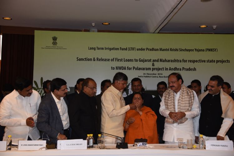 Andhra Pradesh Chief Minister N. Chandrababu Naidu, Union Finance Minister Arun Jaitley, Irrigation Minister Uma Bharati and other ministers participated in Sanction and Release of First Loans to Gujarat and Maharastra for respective state projects to NWDA for Polavaram Project in Andhra Pradesh under Pradhan Mantri Krishi Sinchayee Yojana(PMKSY) on 26th December 2016.