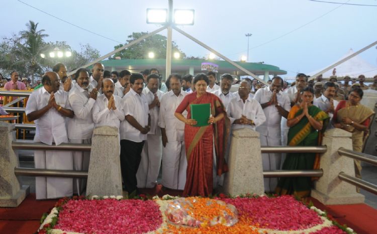 AIADMK's new General Secretary Sasikala Natarajan along with Chief Minister O Panneerselvam and other senior AIADMK ministers visited the to Jayalalithaa’s grave at the Marina Beach around 5:30pm on Friday to seek the late leader’s blessings.