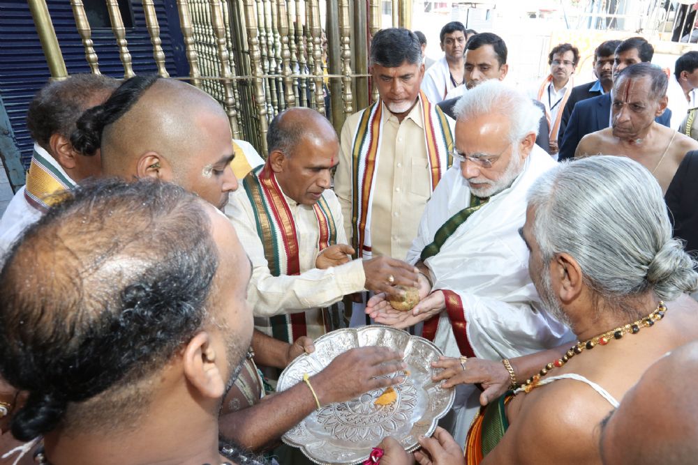 Prime Minister of India, Narendra Modi on Tuesday offered prayers at the famous hill shrine of Lord Venkateswara in Tirumala. He was accompanied by Governor E.S.L. Narasimhan, Chief Minister N. Chandrababu Naidu, Union Minister Sujana Chowdary for darshan.