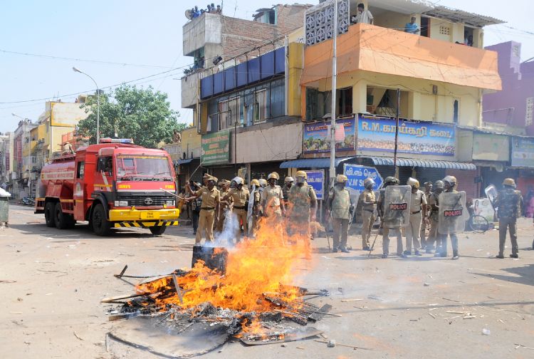 Protest turns violent on Chennai’s Marina Beach after retreating protesters vehicles torched and petrol bombs lobbed in Chennai City on 23rd January 2017.