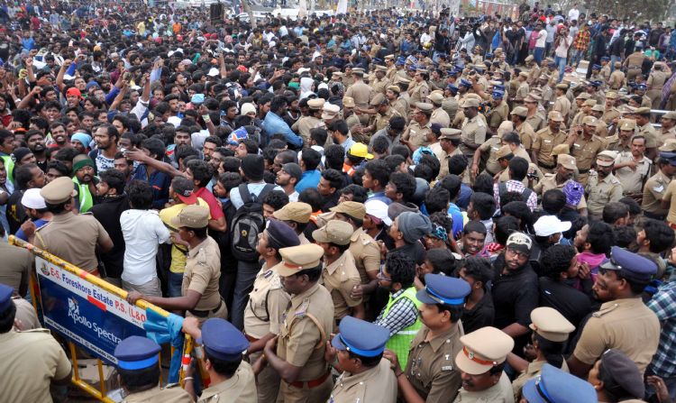 Protest turns violent on Chennai’s Marina Beach after retreating protesters vehicles torched and petrol bombs lobbed in Chennai City on 23rd January 2017.