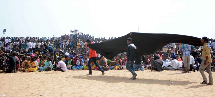 Protest turns violent on Chennai’s Marina Beach after retreating protesters vehicles torched and petrol bombs lobbed in Chennai City on 23rd January 2017.
