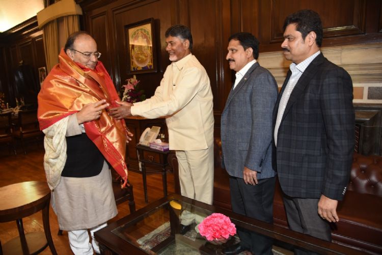 Chief Minister of Andhra Pradesh Nara Chandrababu Naidu meeting with Union Minister for Finance Arun Jaitley at New Delhi on 23rd January 2017. Y.S. Choudhary, Union Minister of State for Science & Technology and C.M. Ramesh, Member of Parliament (RS) are also seen.