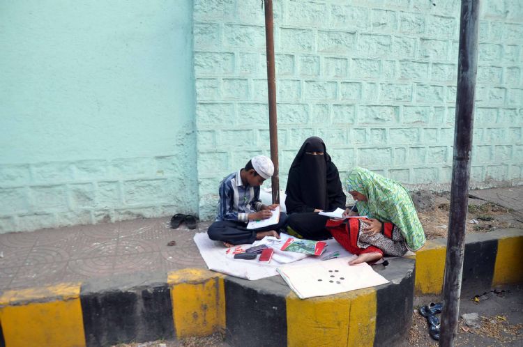 While a woman is begging on a footpath near Moghalpura Playground, her children are busy in their studies - INN Photos