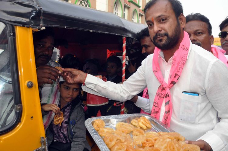 TRS activists celebrating party's victory at Charminar by distributing sweets - INN Photos