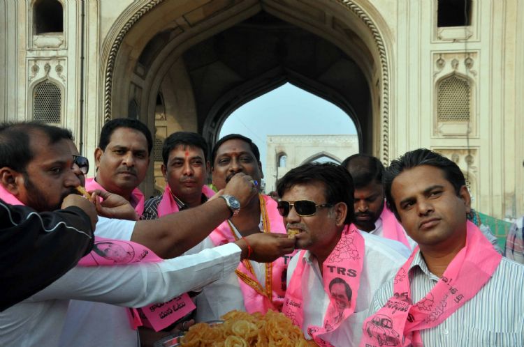 TRS activists celebrating party's victory at Charminar by distributing sweets - INN Photos