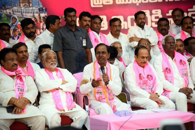 Caretaker Chief Minister and TRS President K Chandrasheker Rao at Telangana Bhavan after winning elections on Tuesday - INN Photos