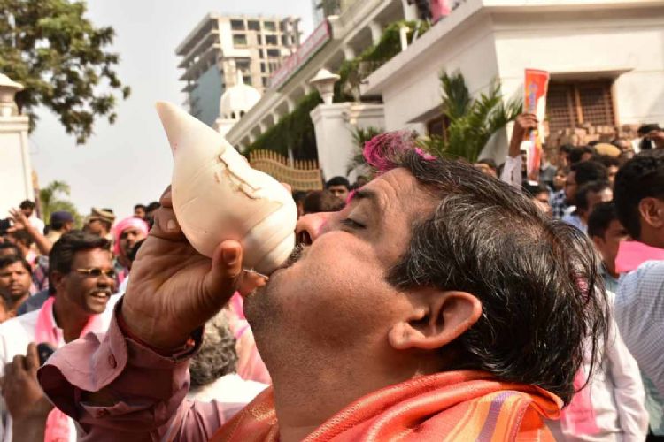 Caretaker Chief Minister and TRS President K Chandrasheker Rao at Telangana Bhavan after winning elections on Tuesday - INN Photos