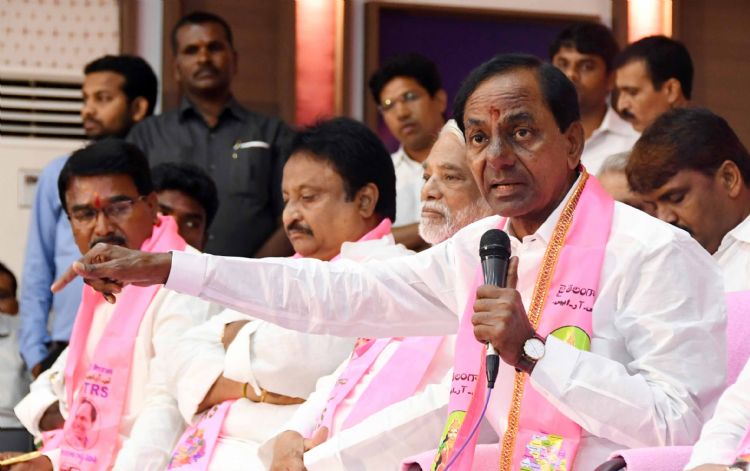 TRS President K Chandrasheker Rao addressing In TRS Legislature Party meeting at Telangana Bhavan on Wednesday - INN Photos