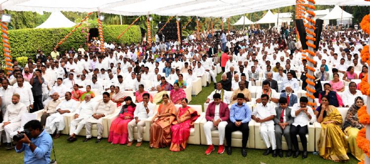 Governor E.S.L. Narasimhan administering oath of office and secrecy to Kalvakuntla Chandrasekhar Rao as the Chief Minister of Telangana State at Raj Bhavan on Thursday - INN Photos