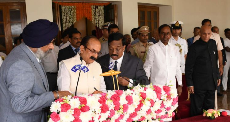 Governor E.S.L. Narasimhan administering oath of office and secrecy to Kalvakuntla Chandrasekhar Rao as the Chief Minister of Telangana State at Raj Bhavan on Thursday - INN Photos