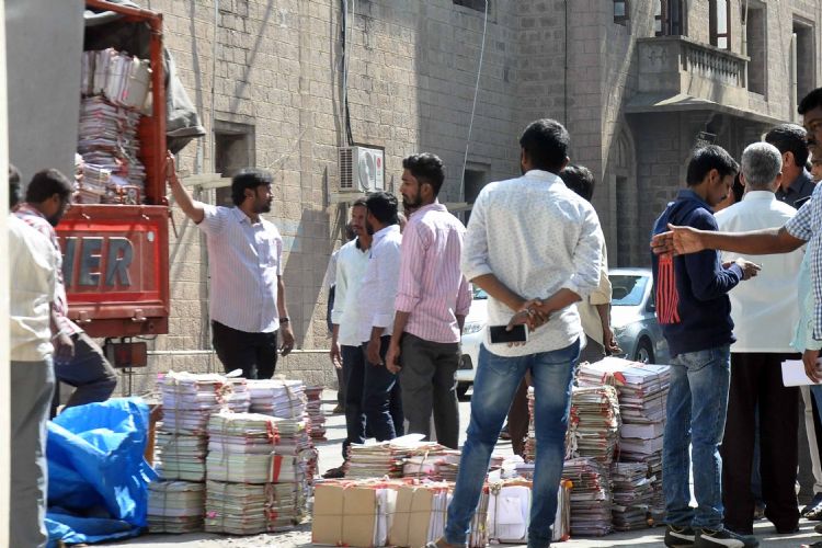 Staff of Andhra Pradesh High Court, along with the files, shifting from Hyderabad on Monday. While Telangana advocates celebrated the occasion, advocates from Rayalaseema staged protest before the Hyderabad High Court - INN Photos