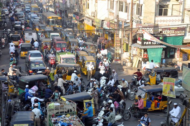 Huge traffic jam was witnessed on Darusshifa To Miralam Mandi Road with Traffic Police diverting all heavy vehicles from Chanchalguda in view of rectification works of power cables in Malakpet - INN Photos