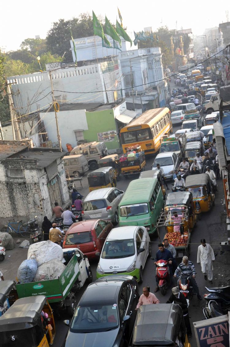 Huge traffic jam was witnessed on Darusshifa To Miralam Mandi Road with Traffic Police diverting all heavy vehicles from Chanchalguda in view of rectification works of power cables in Malakpet - INN Photos