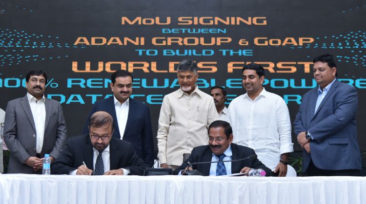 A Memorandum of Understanding (MoU) is signed between Adani group and Government of Andhra Pradesh on Wednesday to establish 5 GW World's first renewable powered data center. Andhra Pradesh Chief Minister Chandra Babu Naidu and IT Minister Lokesh are present.