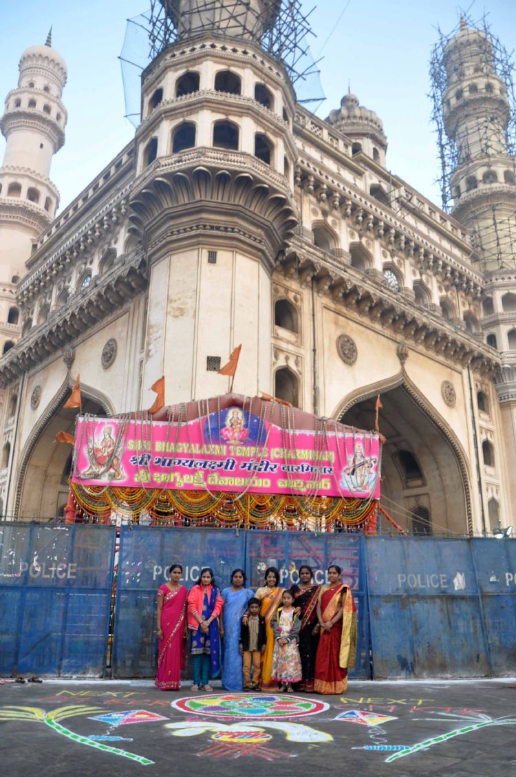 Next Prime Minister KCR: Women activists of TRS make Rangoli in front of Charminar on Saturday as part of Sankranti festival. INN Photos.