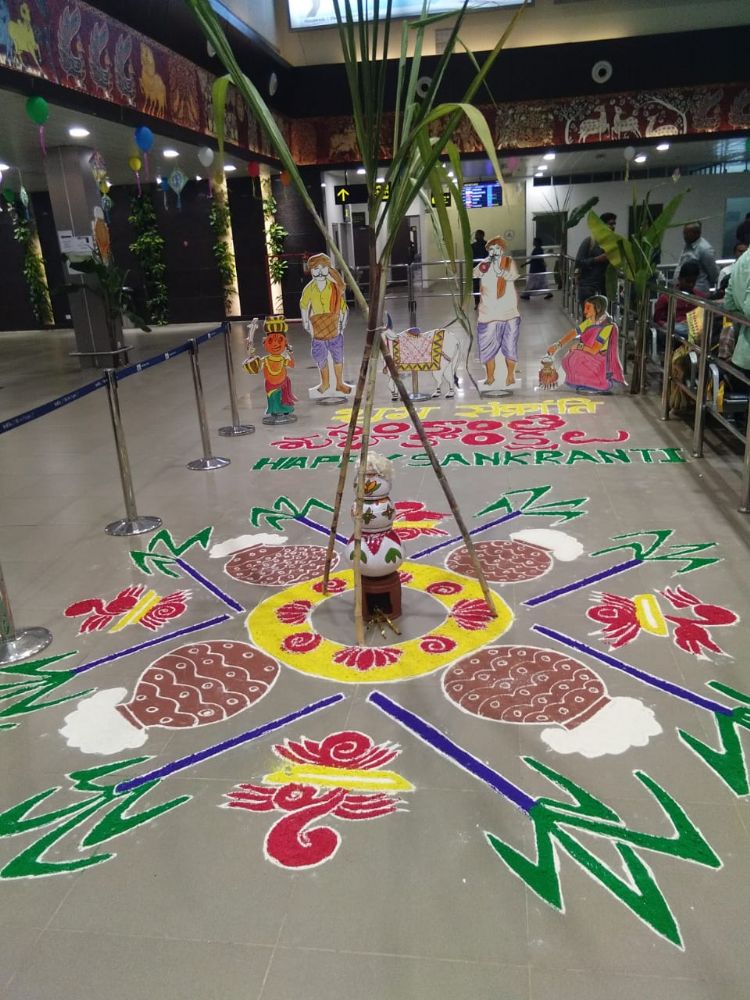 Vijayawada International Airport got decorated for Sankranthi Festival. Traditional Muggulu welcomed the travellors at the Airport on Monday.