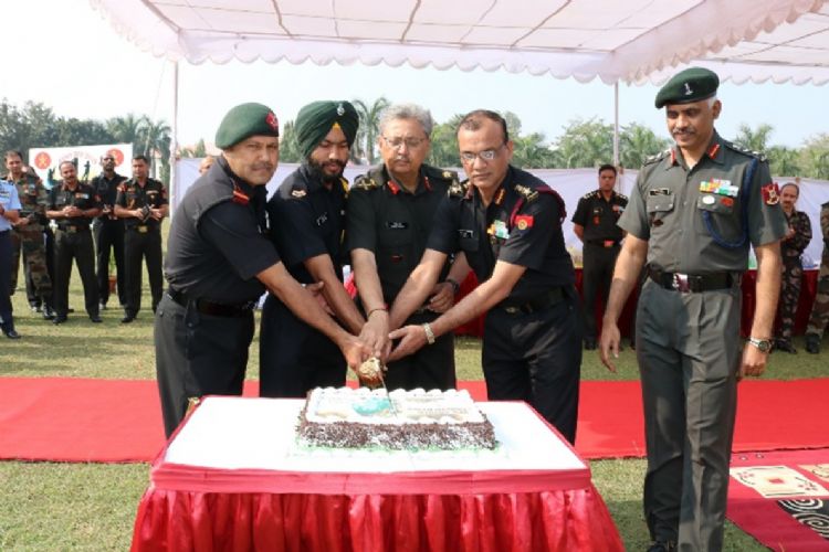 Major General Sandeep Sharma, Commandant, College of Defence Management (CDM) celebrating Army Day by cutting cake along with other officers at the College in Secunderabad on 15 Jan 2019.