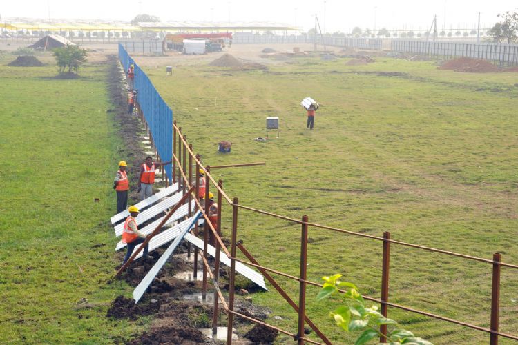 Ikon Bridge works are progressing at Amaravati. Engineers are doing soil test in the Krishna River and a compound wall is being built to start the bridge works.