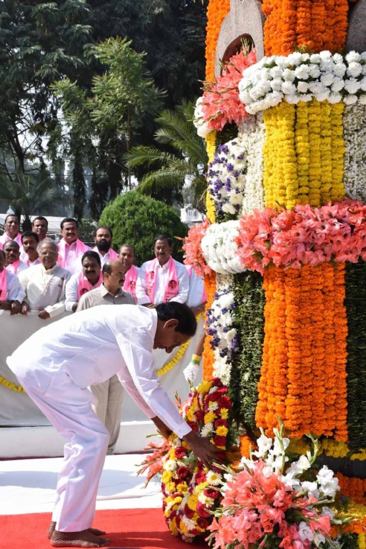 Chief Minister K Chandrasheker Rao, along with TRS MLAs, paying tributes to Telangana Martyrs at Gun Park on Thursday - INN Photos
