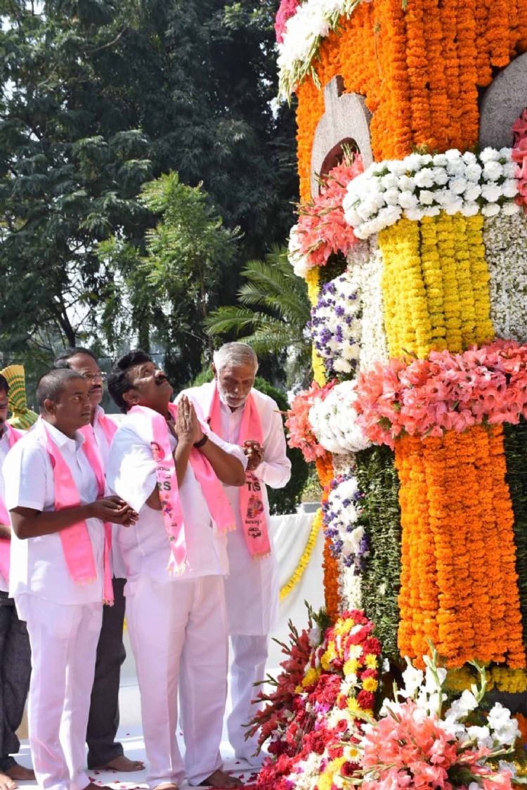 Chief Minister K Chandrasheker Rao, along with TRS MLAs, paying tributes to Telangana Martyrs at Gun Park on Thursday - INN Photos