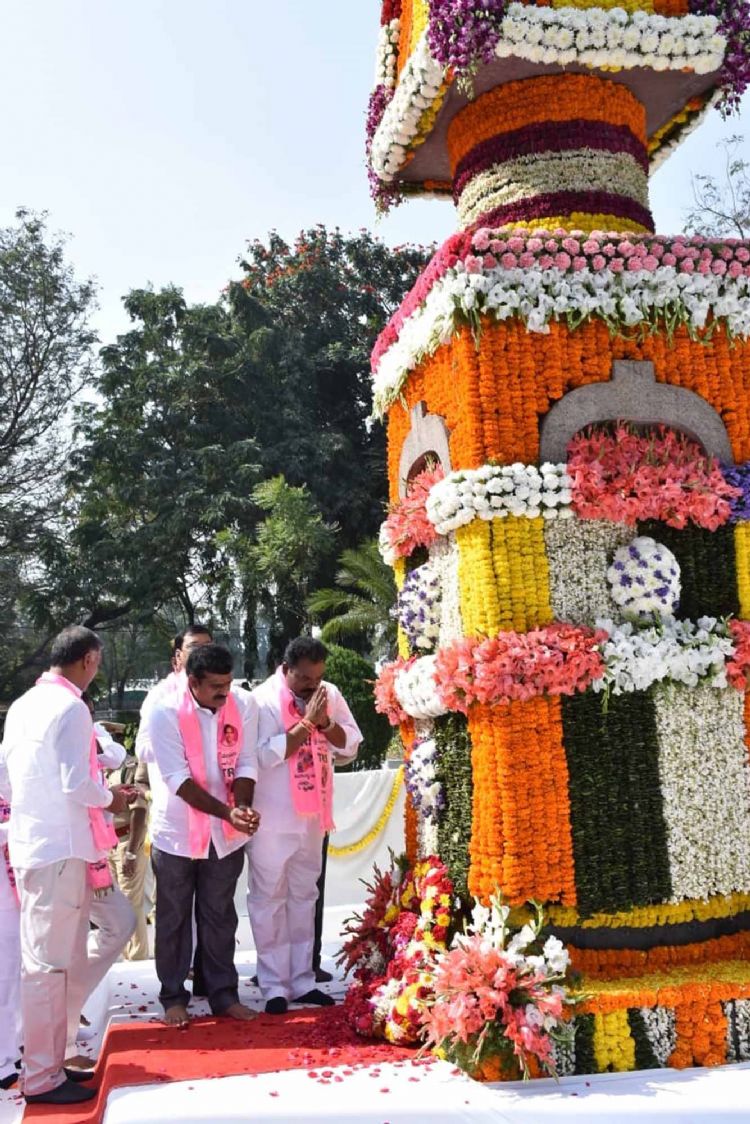 Chief Minister K Chandrasheker Rao, along with TRS MLAs, paying tributes to Telangana Martyrs at Gun Park on Thursday - INN Photos