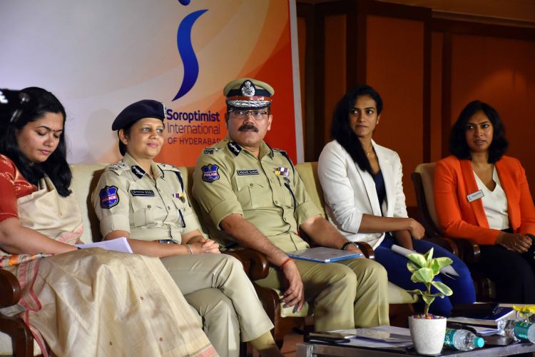 Badminton Star P V Sindhu, along with Hyderabad Police Commissioner Anjani Kumar and Addl CP Crimes & SIT Shikha Goel launch the the AV at a symposium on Sexual Harassment of Women at Workplace, an initiative by She Teams Hyderabad Police in association with Soroptimist International here on Friday - INN Photos