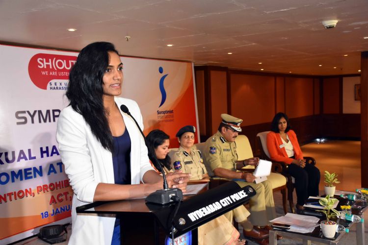 Badminton Star P V Sindhu, along with Hyderabad Police Commissioner Anjani Kumar and Addl CP Crimes & SIT Shikha Goel launch the the AV at a symposium on Sexual Harassment of Women at Workplace, an initiative by She Teams Hyderabad Police in association with Soroptimist International here on Friday - INN Photos