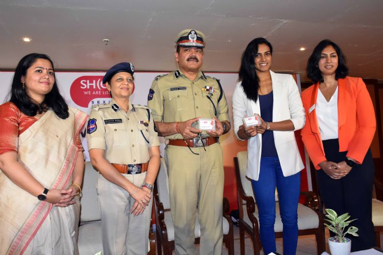 Badminton Star P V Sindhu, along with Hyderabad Police Commissioner Anjani Kumar and Addl CP Crimes & SIT Shikha Goel launch the the AV at a symposium on Sexual Harassment of Women at Workplace, an initiative by She Teams Hyderabad Police in association with Soroptimist International here on Friday - INN Photos