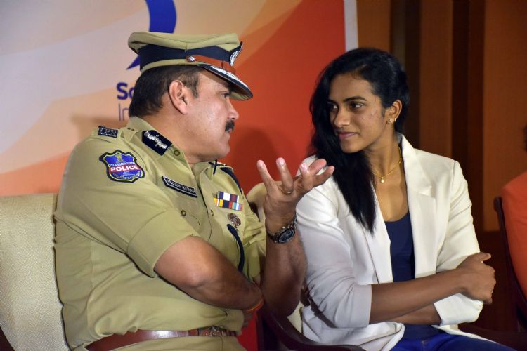 Badminton Star P V Sindhu, along with Hyderabad Police Commissioner Anjani Kumar and Addl CP Crimes & SIT Shikha Goel launch the the AV at a symposium on Sexual Harassment of Women at Workplace, an initiative by She Teams Hyderabad Police in association with Soroptimist International here on Friday - INN Photos