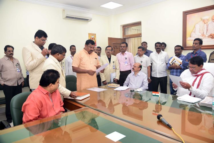 BJP leader D. Raja Singh takes oath as MLA before Assembly Speaker Pocharam Srinivas Reddy in the latter's chambers on Saturday. He earlier declined to take oath in front of Mumtaz Ahmed Khan because his MIM party tries to vanish Hindus and does not want Telangana to be developed.