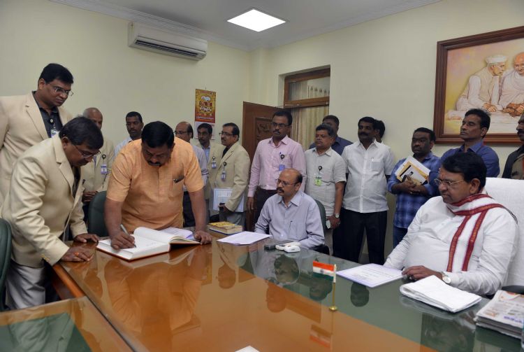 BJP leader D. Raja Singh takes oath as MLA before Assembly Speaker Pocharam Srinivas Reddy in the latter's chambers on Saturday. He earlier declined to take oath in front of Mumtaz Ahmed Khan because his MIM party tries to vanish Hindus and does not want Telangana to be developed.