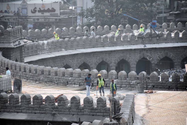 GHMC workers carrying out restoration works at Mouzam Jahi market - INN Photos