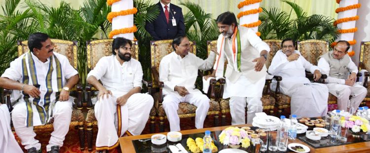 Governor of Andhra Pradesh and Telangana E.S.L. Narasimhan organized a Dinner at Raj Bhavan and many leaders including CM KCR and Janasena Chief Pawan Kalyan attended the event.