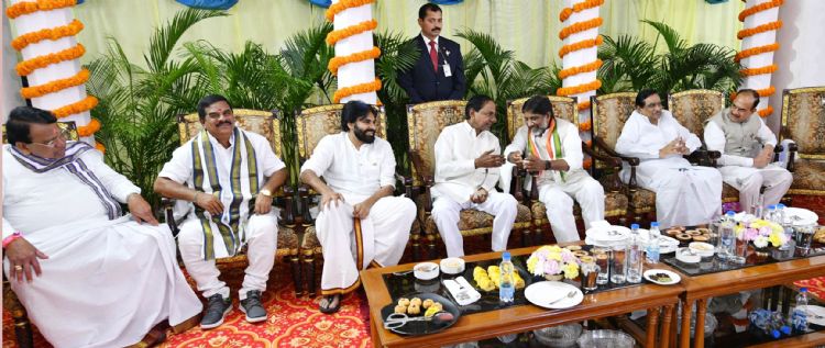 Governor of Andhra Pradesh and Telangana E.S.L. Narasimhan organized a Dinner at Raj Bhavan and many leaders including CM KCR and Janasena Chief Pawan Kalyan attended the event.