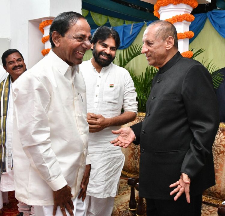 Governor of Andhra Pradesh and Telangana E.S.L. Narasimhan organized a Dinner at Raj Bhavan and many leaders including CM KCR and Janasena Chief Pawan Kalyan attended the event.