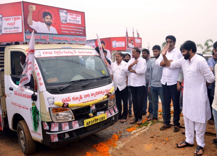 Janasena party chief Pawan Kalyan launched 17 campaign vehicles on Monday. These vehicles will travel to villages and campaign for the party. Arrangements were made to give Tea to the people to popularize the party symbol Tea glass.